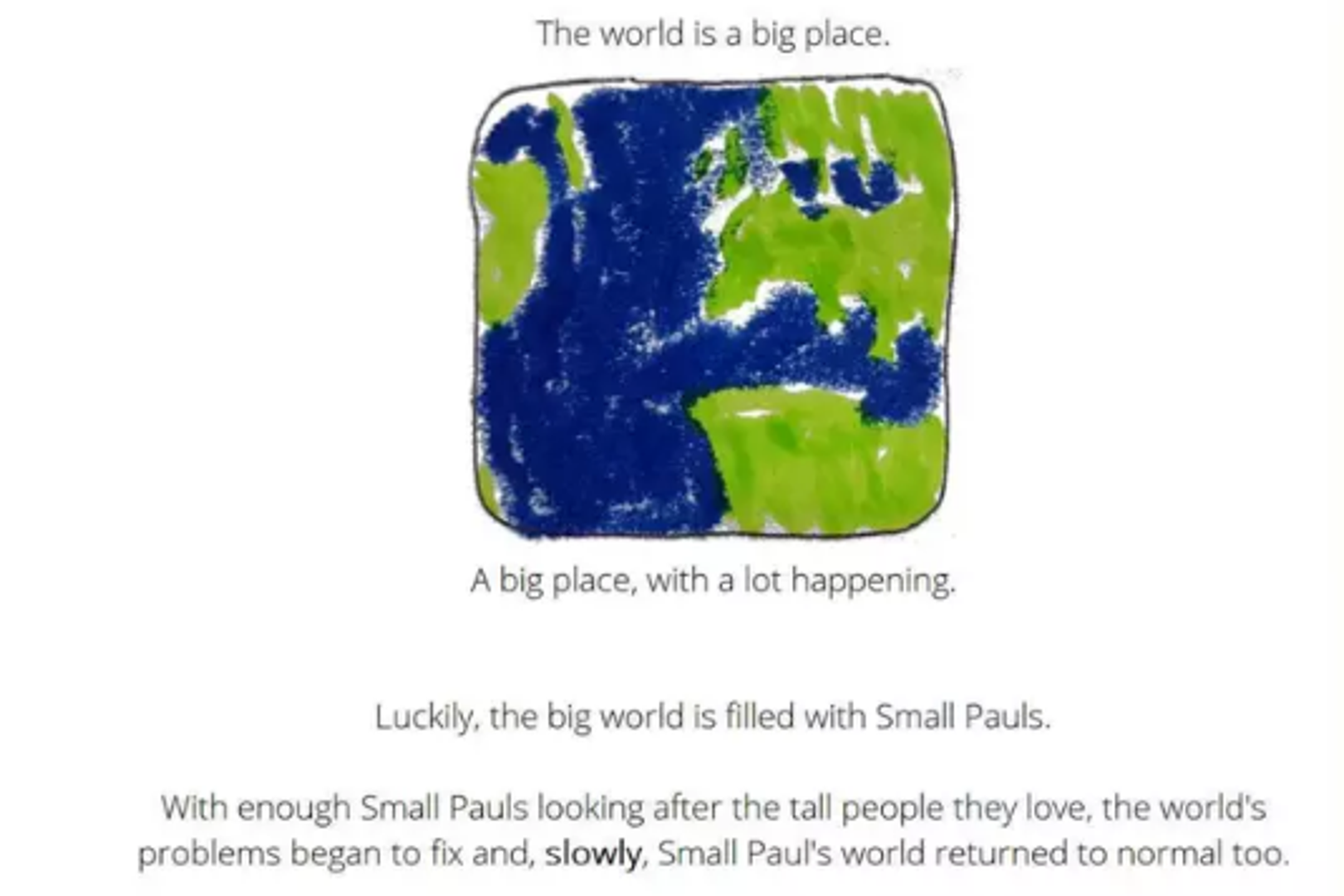 "Maleni Paul" (originalno Small Paul), priča koju možete pročitati ovdje, uči djecu kako da ostanu hrabri i pozitivni u ovoj strašnoj i kompliciranoj situaciji o kojoj ''visoki ljudi'' cijelo vrijeme pričaju.