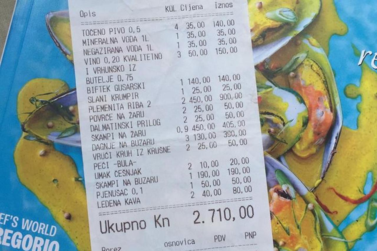 Iznos na računu premašio je 2700 kuna, no na meniju su bili škampi, brancin, biftek, vino, pivo, pjenušac... Smatrate li da ste i vi previše platili jelo ili piće na Jadranu? Pošaljite nam Vaše račune na javi@vecernji.net.
