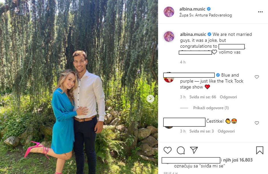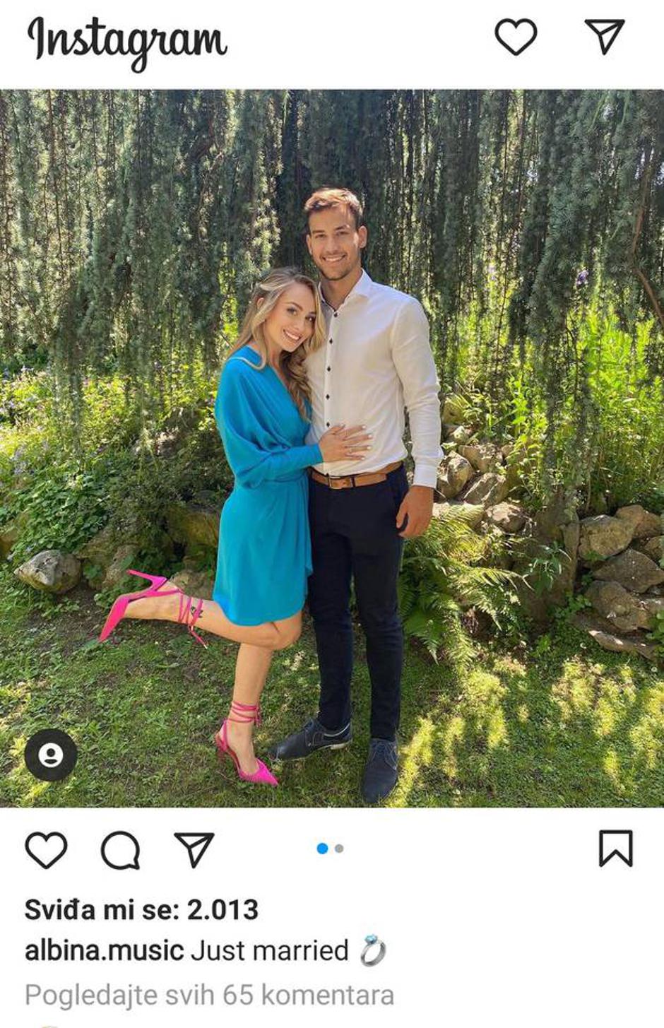 Nekoliko dana nakon što je na splitskoj rivi uživala u Ivanovom zagrljaju Albina je objavila fotografiju koja je poprilično zbunila njezine obožavatelje. "Upravo vjenčani", napisala je uz fotografiju ispod koje su se počele nizati čestitke.