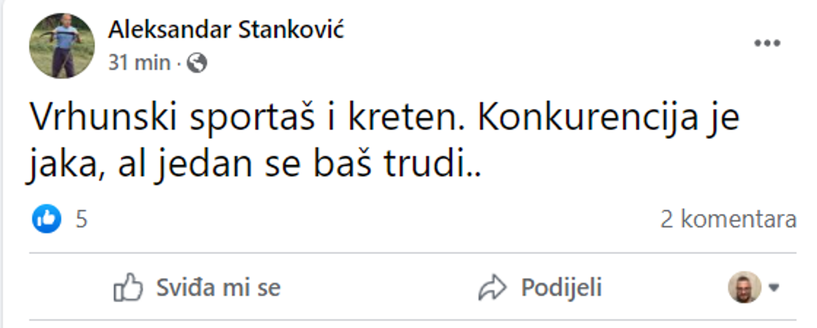 - Vrhunski sportaš i kreten. Ima ih dosta, al ovih dana jedan se baš trudi - napisao je Stanković, očito misleći na srpskog tenisača.