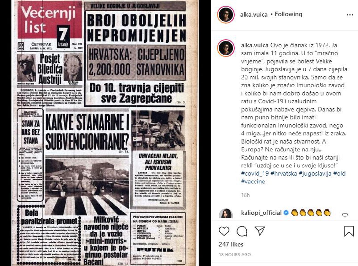 "Ovo je članak iz 1972. Ja sam imala 11 godina. U to “mračno vrijeme”, pojavila se bolest Velike boginje. Jugoslavija je u 7 dana cijepila 20 mil. svojih stanovnika. Samo da se zna koliko je značio Imunološki zavod i koliko bi nam dobro došao u ovom ratu s Covid-19 i uzaludnim pokušajima nabave cjepiva. Danas bi nam puno bitnije bilo imati funkcionalan Imunološki zavod, nego 4 miga...jer nitko neće napasti iz zraka. Biološki rat je naša stvarnost. A Europa? Ne računajte na nju... Računajte na nas ili što bi naši stariji rekli “uzdaj se u se i u svoje kljuse!”", napisala je Alka.