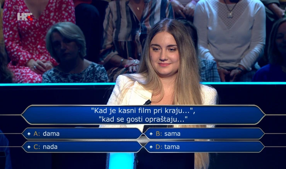 - Potvrdio je ono što ja mislim, a Vi ste me naveli da sumnjam u svoj odgovor. Moram razmisliti, dodala je Doris i zatražila džokera pola-pola. Ostali su jureći kombi i snježna lavina.
