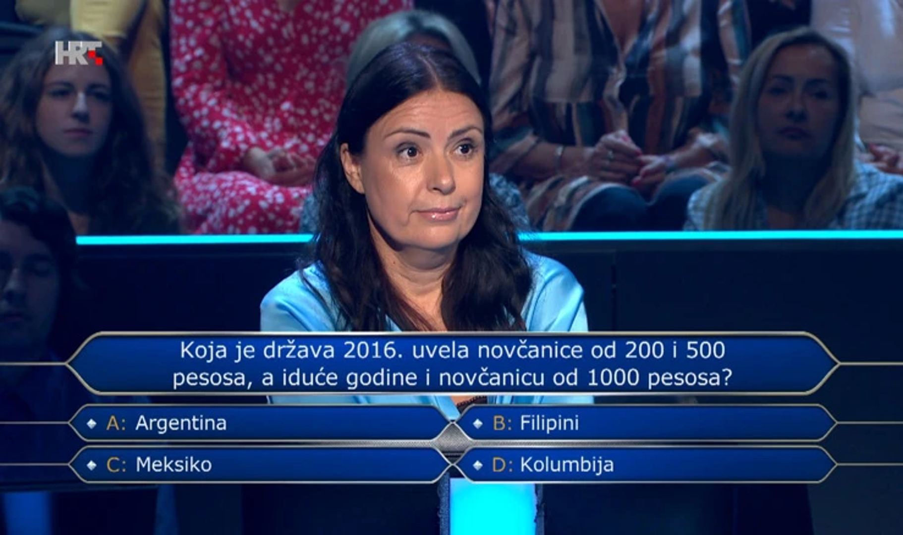 Na pitanju za 16.000 kuna, Ana je zatražila pomoć džokera zovi. Pitanje je glasilo: Koja je država 2016. uvela novčanicu od 200 i 500 pesosa, a iduće godine i novčanicu od 1000 pesosa? Argentina, Filipini, Meksiko ili Kolumbija?