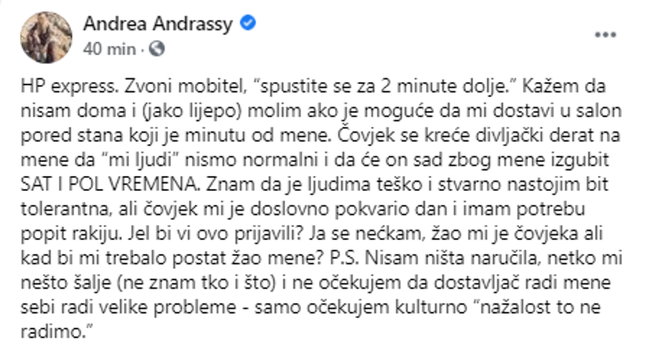 Blogerica i kolumnistica Andrea Andrassy na Facebooku je prepričala neugodan događaj s poštarom koji joj je trebao donijeti paket.