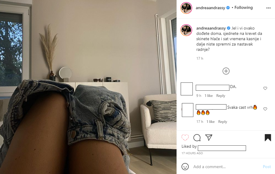 Blogerica i kolumnistica Andrea Andrassy (36) na svojem je Instagram profilu objavila malo drugačiju fotografiju. Naime, na fotografiji se vide samo njezine noge, a vidi se da je i hlače na pola skinula. Ovu fotografiju je objavila kako bi upitala svoje pratitelje imaju li i oni sličnih problema kao ona. "Je li i vi ovako dođete doma, sjednete na krevet da skinete hlače i sat vremena kasnije i dalje niste spremni za nastavak radnje?", upitala je Andrassy svoje pratitelje u opisu.