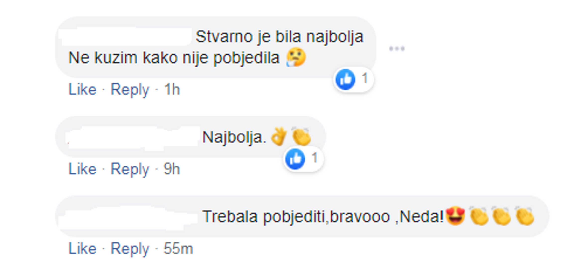 – Stvarno je bila najbolja. Ne kužim kako nije pobijedila – komentirala je jedna gledateljica. Druga se složila i dodala da je bila najbolja, dok je treća napisala kako je Neda definitivno trebala pobijediti.