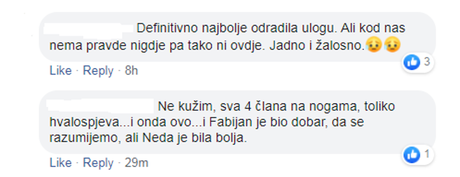 – Definitivno najbolje odradila ulogu. Ali kod nas nema pravde nigdje pa tako ni ovdje. Jadno i žalosno – stoji u jednom komentaru dok se na njega nadovezala još jedna gledateljica.