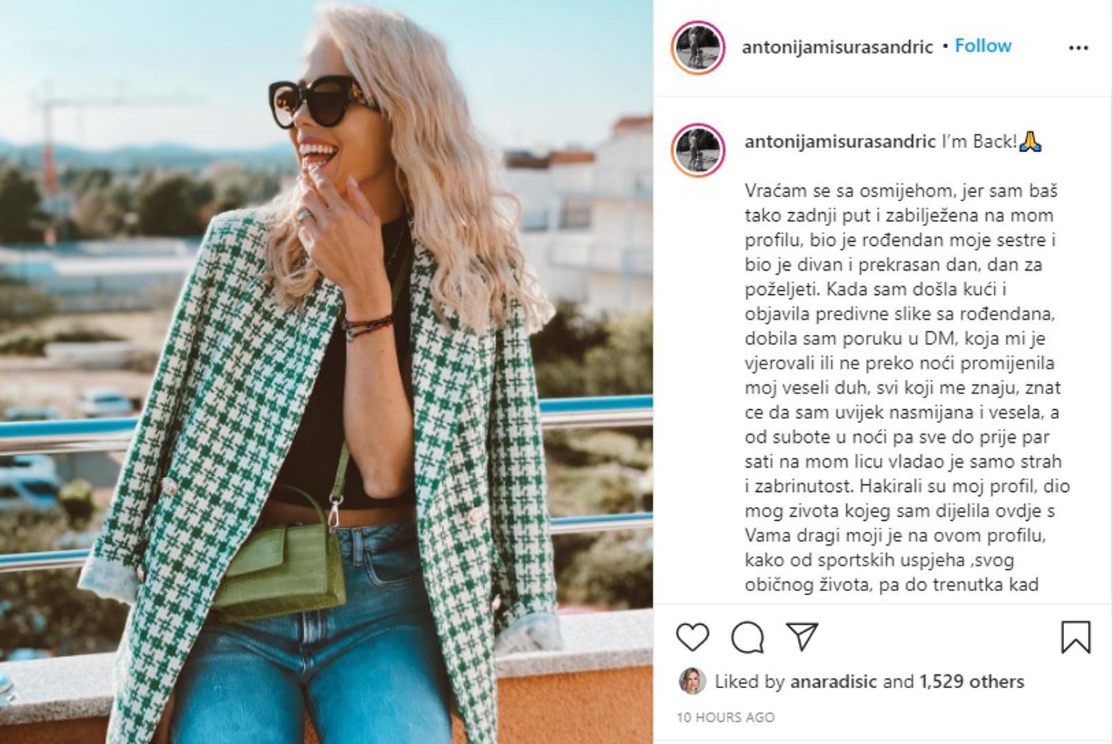 Košarkašica Antonija Mišura Sandrić na Instagramu je objavila kako su joj hakirali Instagram profil. Šibenčanka se javila obožavateljima na ovoj društvenoj mreži i opisala zašto je izbivala s Instagrama.