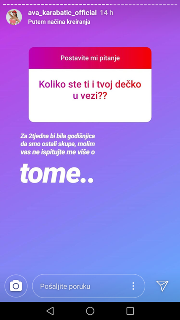 - Pa voljela sam ga, ali ako ćemo se svađati na svaki moj korak što on ne razumije jer je konzervativan, što ja tu mogu... - napisala je Ava. Otkrila je među ostalim da se i naljutila na njega, a onda je ponovno zamolila fanove da ne ispituju.