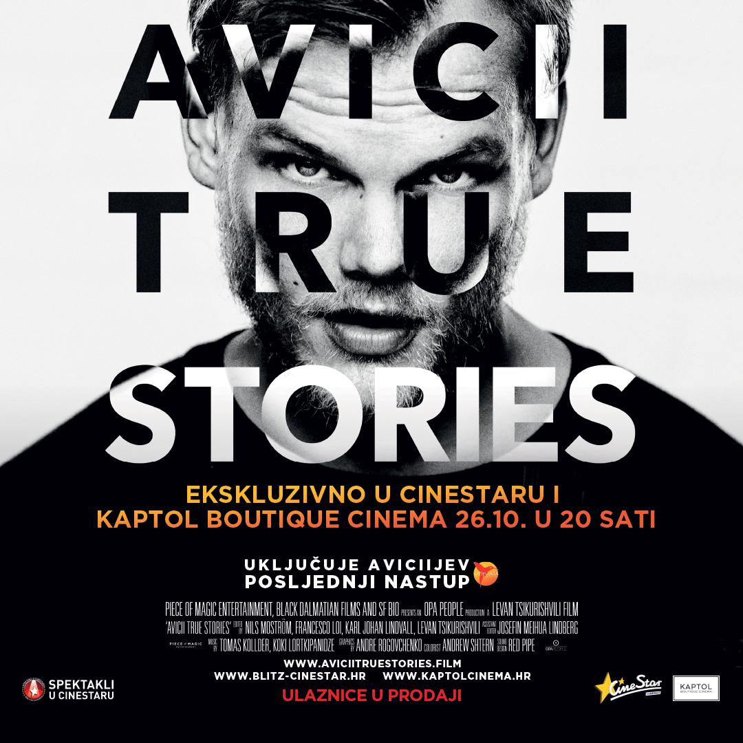 “Avicii: True Stories” govori o neuljepšanoj istini koja se krije iza panetarnog uspjeha ali i kontroverznog povlačenja mladog producenta nominiranog za prestižnu glazbenu nagradu Grammy te skladatelja i izvođača poznatog pod imenom AVICII (a.k.a. Tim Bergling). Projekcija uključuje i 30 minutni nastup s Aviciijevog posljednjeg seta na Ibizi kojeg je održao prije godinu dana, točnije 26. kolovoza 2016.