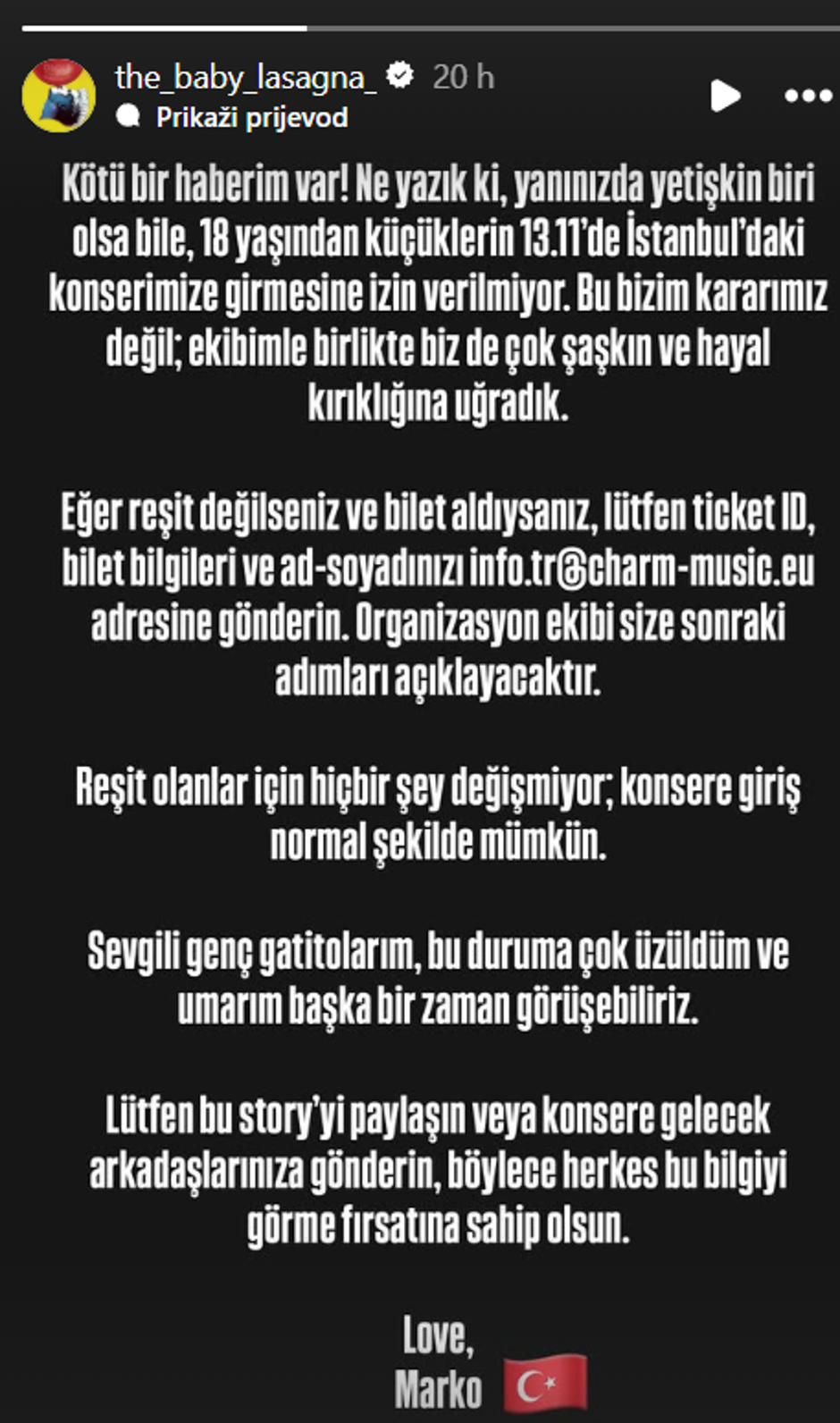 "Imam loše vijesti! Nažalost djeci ispod 18 godina nije dozvoljen ulazak na naš koncert u Istanbulu 13.11. čak i ako pored sebe imate odraslu osobu. Ovo nije naša odluka; moj tim i ja smo bili vrlo iznenađeni i razočarani", napisao je Baby Lasagna na Instastoryju, pozvavši sve maloljetnike koji su kupili ulaznicu da pošalju svoje podatke za povrat novca.