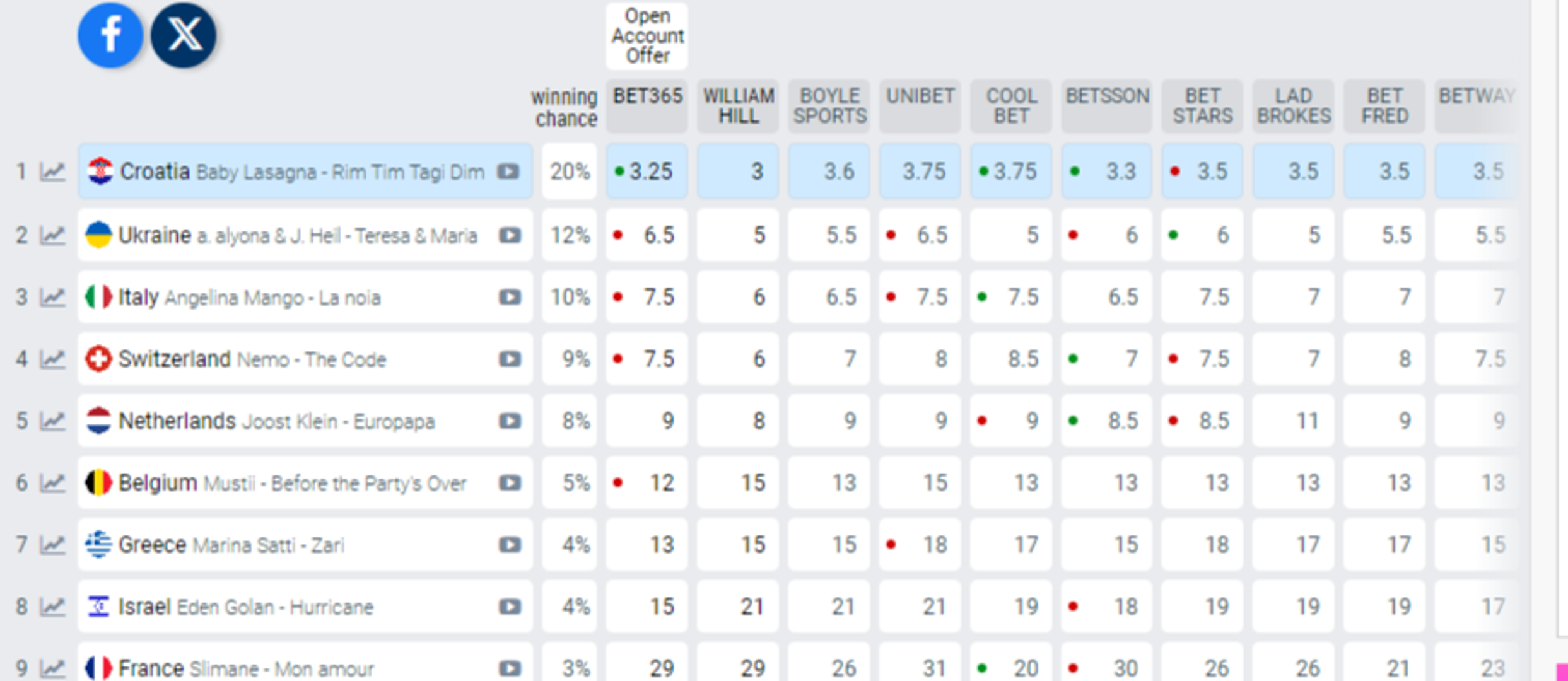 Na drugom mjestu eurovizijskih kladionica je Ukrajina s 12 posto šanse za pobjedu, a na trećem mjestu je Italija kojoj daju 10 posto šanse za pobjedu. Slovenska predstavnica Raiven trenutačno je na 25. mjestu s 1 posto šanse za pobjedu, a srpska predstavnica Teya Dora nalazi se na 20. mjestu.