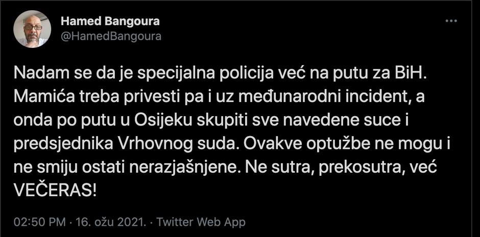 Bivši televizijski voditelj Hamed Bangoura osvrnuo se na pravomoćnu presudu u slučaju braće Mamić a koja kaže kako Zdravko Mamić mora u zatvor na šest i pol godina zbog izvlačenja najmanje 116 milijuna kuna iz Dinama. Zdravko Mamić nalazi se u Bosni i Hercegovini i jučer je na konferenciji za medije rekao kako će kaznu odslužiti samo u zatvoru u BiH. Bangoura je to prokomentirao na Twitteru i napisao sljedeće: Nadam se da je specijalna policija već na putu za BiH. Mamića treba privesti pa i uz međunarodni incident, a onda po putu u Osijeku skupiti sve navedene suce i predsjednika Vrhovnog suda. Ovakve optužbe ne mogu i ne smiju ostati nerazjašnjene.