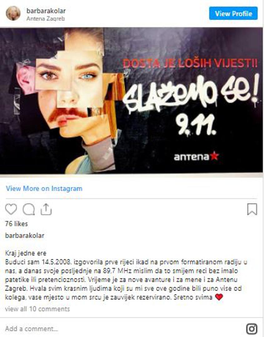 Mnogima omiljena voditeljica Barbara Kolar na društvenim mrežama otkrila je da nakon 12 godina neće više raditi na Anteni Zagreb. Sve je objasnila u kratkom statusu te je napisala kako su joj suradnici u ovih 12 godina bili mnogo više od kolega.