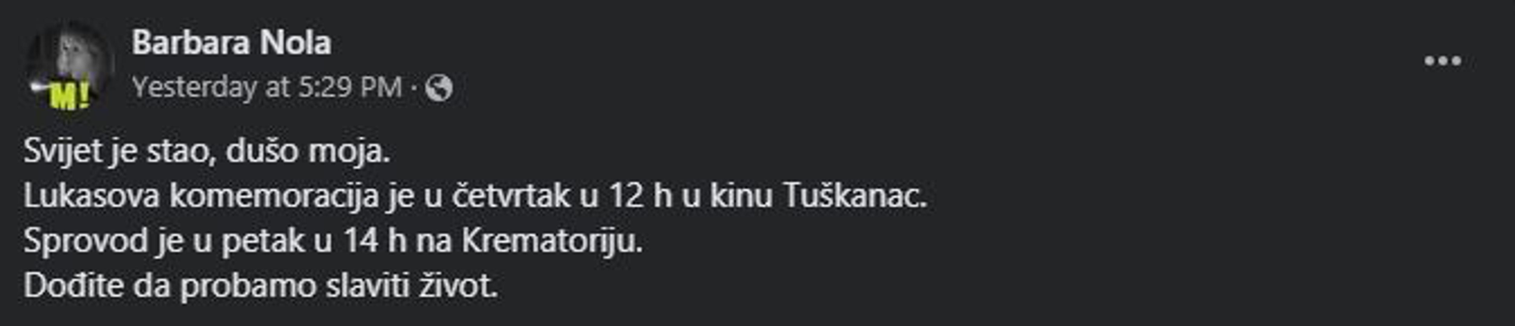 "Svijet je stao, dušo moja. Lukasova komemoracija je u četvrtak u 12 sati u kinu Tuškanac. Sprovod je u petak u 14 sati na Krematoriju. Dođite da probamo slaviti život" napisala je Barbara na Facebooku.