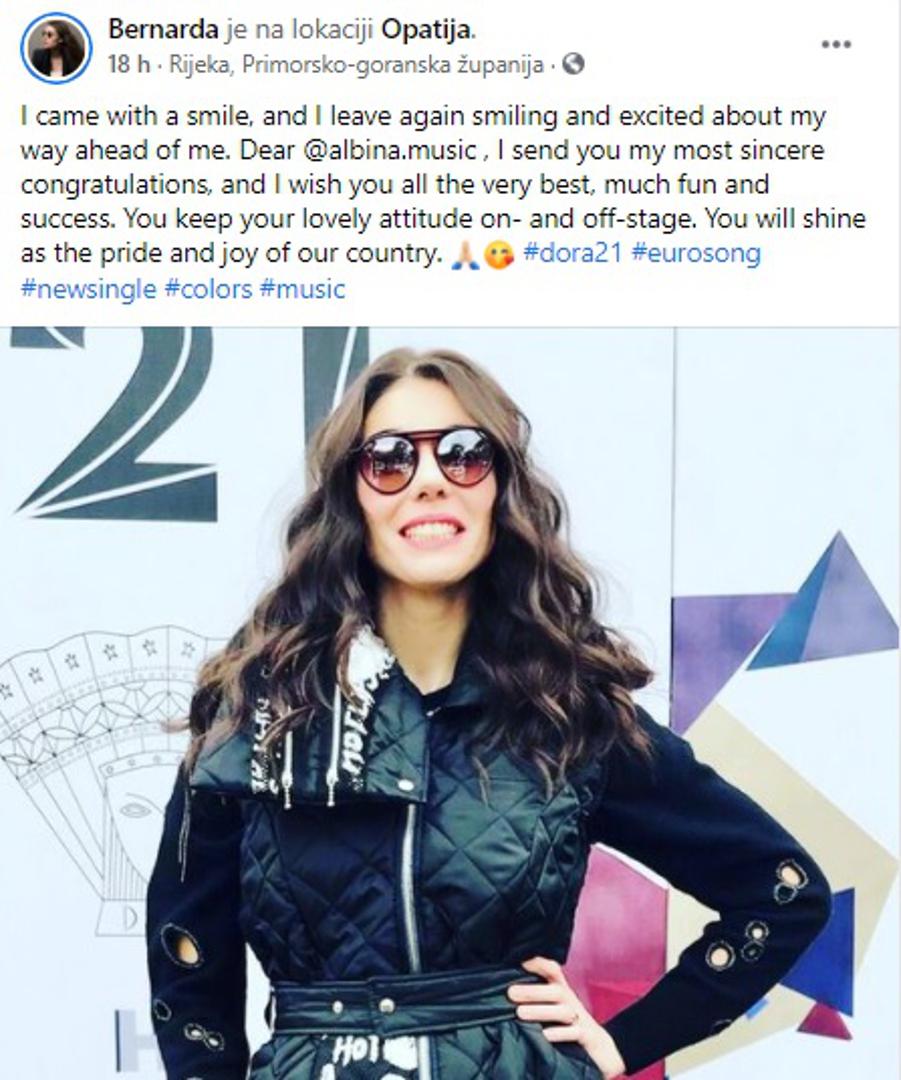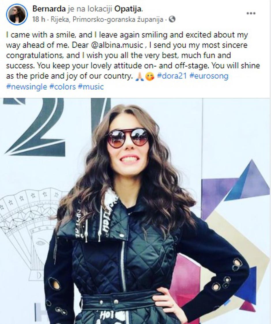 - Došla sam s osmijehom i odlazim s osmijehom jer sam sretna zbog puta koji je preda mnom. Draga Albina, upućujem ti najiskrenije čestitke i želim sve najbolje, puno zabave i uspjeha. Zadrži svoj ljupki stav i na pozornici i izvan nje. Sijat ćeš na ponos i radost naše zemlje, napisala je Bernarda pokraj fotografije na Instagramu.