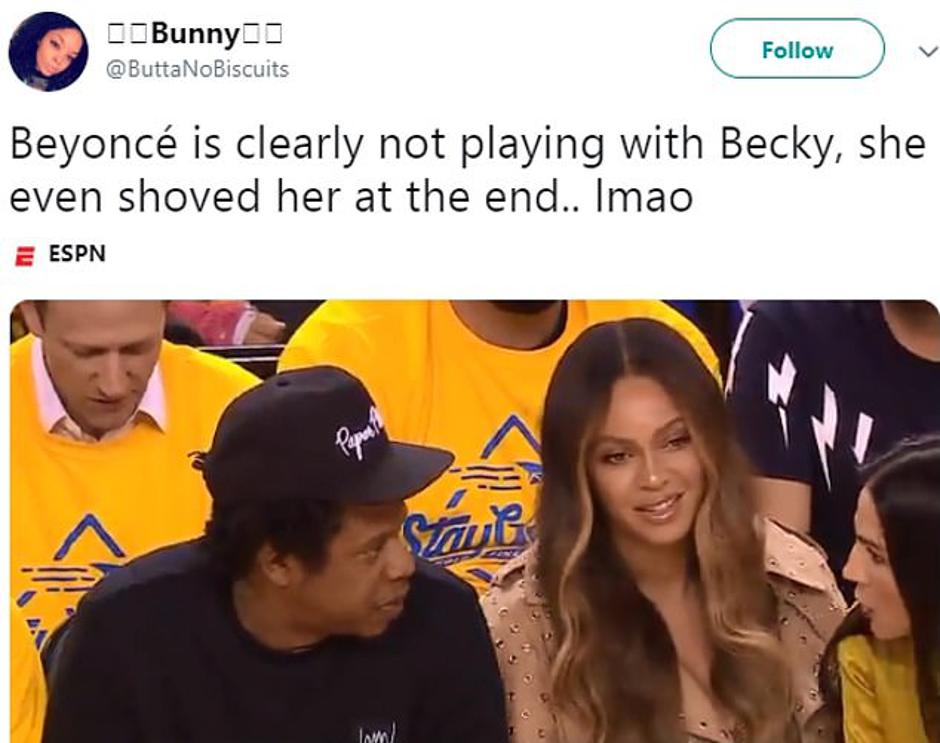Beyonce je sa suprugom Jay Z-jem utakmicu pratila iz prvog reda, a pokraj njih sjedila je Nicole Curran, supruga vlasnika Warriorsa Joea Lacoba. Kamere su uhvatile Nicole kako neobavezno priča s Jay Z-jem, a izraz na Beyonceinom licu pokazivao je frustriranost.