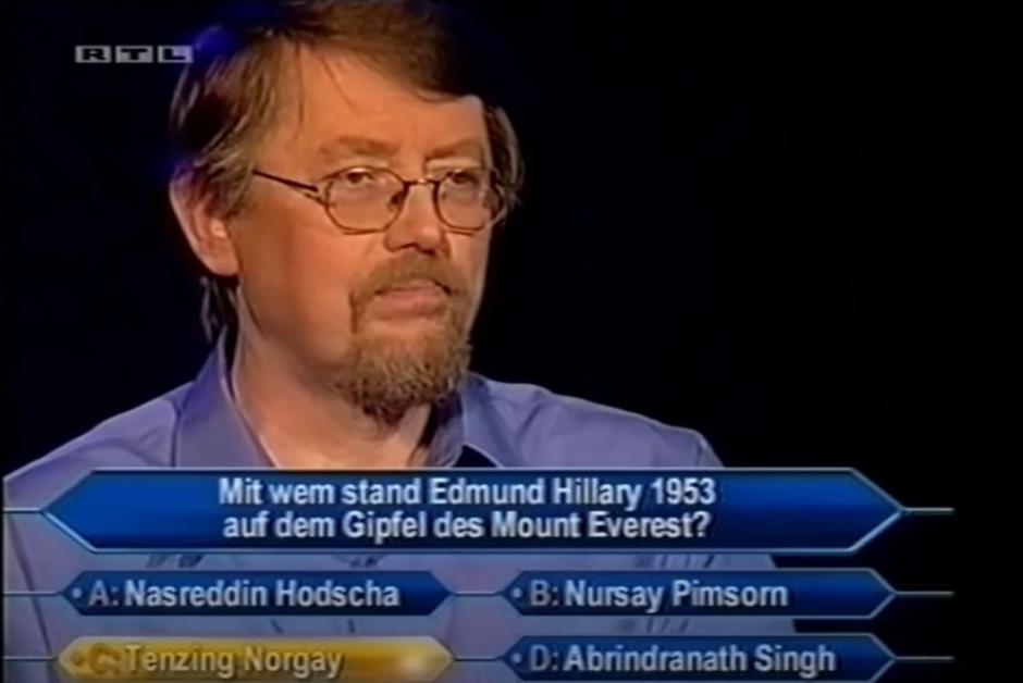 Milijunsko pitanje mu nije predstavljalo problem. Naime, bilo je povezano s njegovom strukom. Glasilo je: 'S kim je 1953. Edmund Hillary stajao na vrhu Mounta Everesta?'