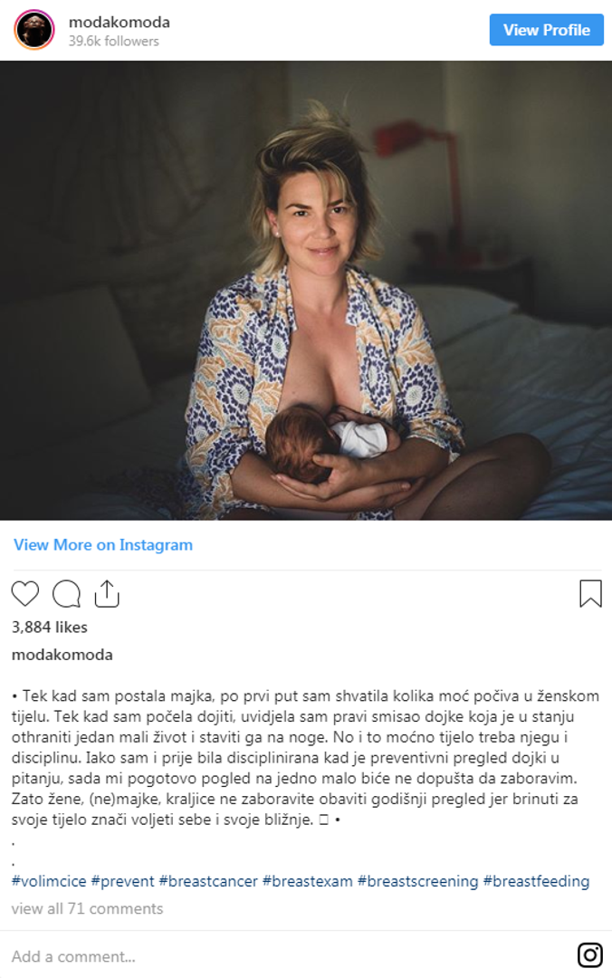 "Tek kad sam postala majka, po prvi put sam shvatila kolika moć počiva u ženskom tijelu. Tek kad sam počela dojiti, uvidjela sam pravi smisao dojke koja je u stanju othraniti jedan mali život i staviti ga na noge. No i to moćno tijelo treba njegu i disciplinu. Iako sam i prije bila disciplinirana kad je preventivni pregled dojki u pitanju, sada mi pogotovo pogled na jedno malo biće ne dopušta da zaboravim. Zato žene, (ne)majke, kraljice ne zaboravite obaviti godišnji pregled jer brinuti za svoje tijelo znači voljeti sebe i svoje bližnje. "
