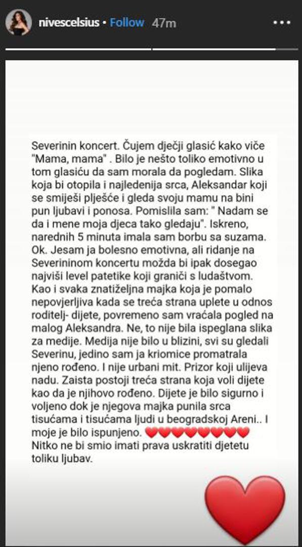 - Severinin koncert. Čujem dječji glasić kako viče "Mama, mama". Bilo je nešto toliko emotivno u tom glasiću da sam morala da pogledam. Slika koja bi otopila i najledenija srca, Aleksandar koji se smiješi i plješće i gleda svoju mamu na bini pun ljubavi i ponosa. Pomislila sam: "Nadam se da i mene moja djeca tako gledaju". Iskreno, narednih pet minuta imala sam borbu sa suzama. Ok. Jesam ja bolesno emotivna, ali ridanje na Severininom koncertu možda bi ipak dosegao najviši level patetike koji graniči s ludaštvom. Kao i svaka znatiželjna majka koja je pomalo nepovjerljiva kada se treća strana uplete u odnos roditelj-dijete, povremeno sam vraćala pogled na malog Aleksandra. Ne, to nije bila ispeglana slika za medije. Medija nije bilo u blizini, svi su gledali Severinu, jedino sam ja kriomice promatrala njeno rođeno. I nije urbani mit. Prizor koji ulijeva nadu. Zaista postoji treća strana koja voli dijete kao da je njihovo rođeno. Dijete je bilo sigurno i voljeno dok je njegova majka punila srca tisućama i tisućama ljudi u beogradskoj Areni...i moje je bilo ispunjeno. Nitko ne bi smio imati prava uskratiti djetetu toliku ljubav - napisala je Celzijus na svom Instagramu.