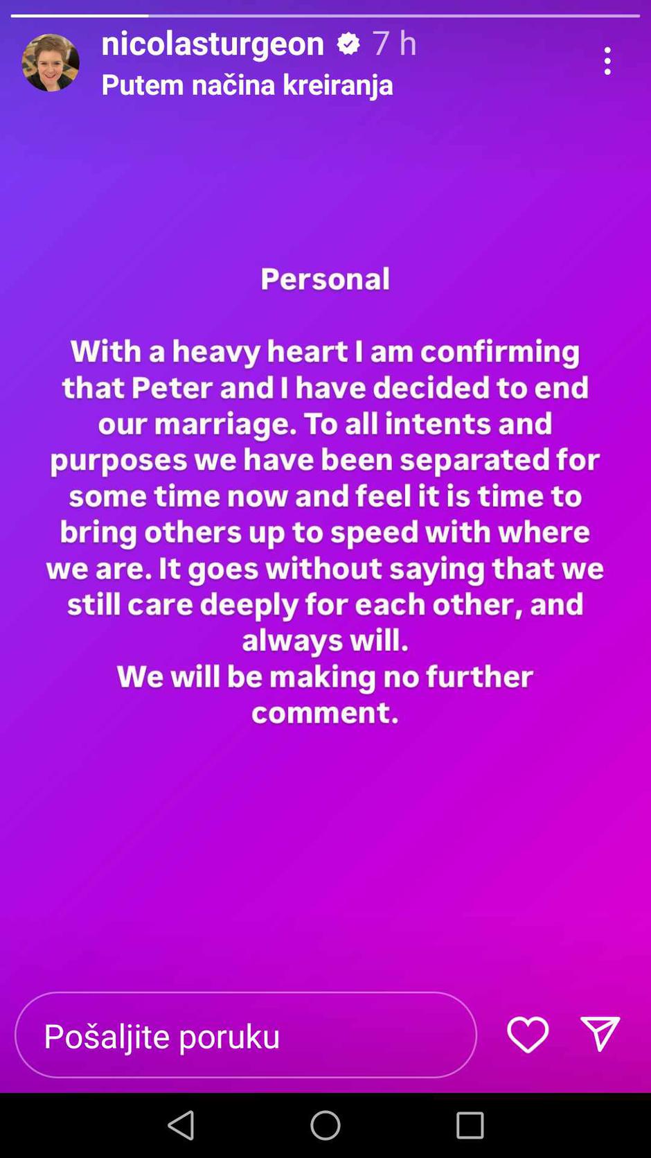 - Teška srca potvrđujem da smo Peter i ja odlučili prekinuti naš brak. U svakom slučaju, već smo neko vrijeme razdvojeni i osjećam da je vrijeme da druge obavijestim o tome gdje smo sada. Ne trebam niti spominjati da nam je još uvijek jako stalo jedno do drugoga i uvijek će tako biti. Nećemo dalje komentirati - napisala je Nicola u pričama na Instagramu.