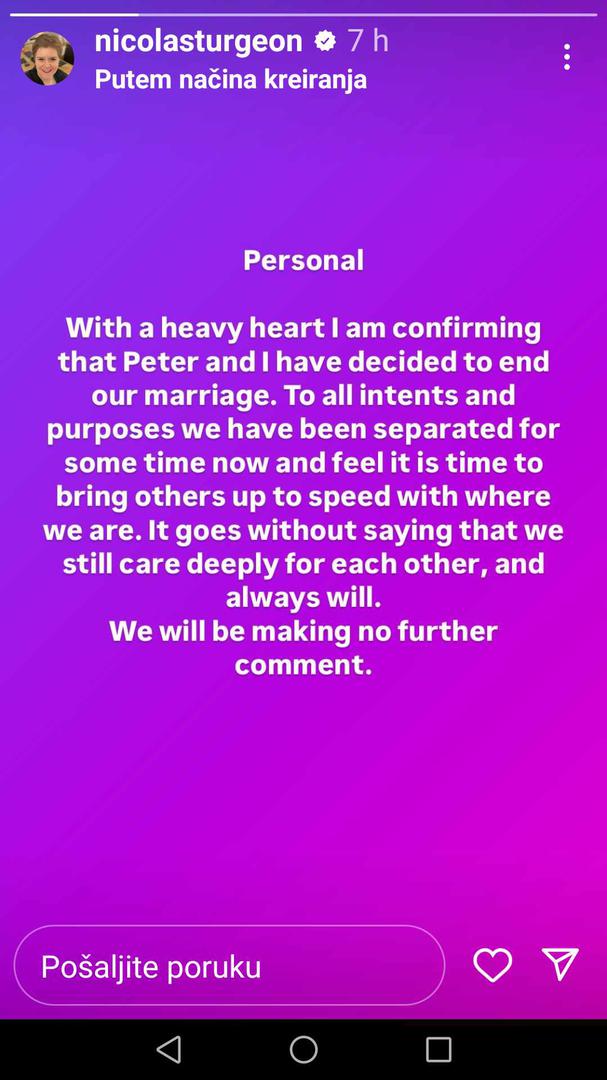Bivša škotska premijerka Nicola Sturgeon (54) objavila je na društvenim mrežama da se razvodi od supruga Petera Murrella (60), bivšeg glavnog izvršnog direktora Škotske nacionalne stranke (SNP), prenosi Daily Mail. Par koji je godinama dominirao škotskom političkom scenom potvrdio je da su već neko vrijeme razdvojeni, a Sturgeon je ranije danas vijest potvrdila putem profila na društvenim mrežama.
