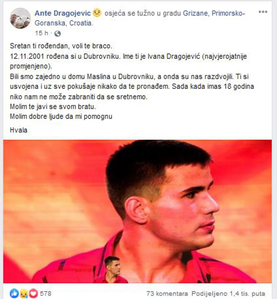 – 12. 11. 2001. rođena si u Dubrovniku. Ime ti je Ivana Dragojević (najvjerojatnije promijenjeno). Bili smo zajedno u domu Maslina u Dubrovniku, a onda su nas razdvojili. Ti si usvojena i uza sve pokušaje nikako da te pronađem. Sada kad imaš 18 godina nitko nam ne može zabraniti da se sretnemo. Molim te, javi se svom bratu – napisao je Ante i zamolio dobre ljude za pomoć. Mnogi su odmah nudili savjete za pomoć u komentarima, a njegova je objava u manje od 24 sata podijeljena više od 1500 puta na Facebooku.