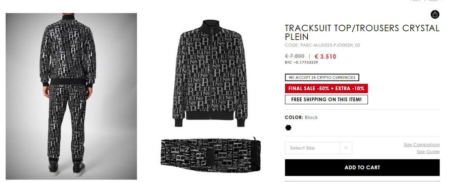 Trenirka ima gornji dio i hlače, a na njoj je kristalićima ispisano ime dizajnera. Prema stranici brenda Philipp Plein, cijeli komplet košta 3510 eura, sa sniženjem, dok je puna cijena ovog artikla bila 7800 eura.