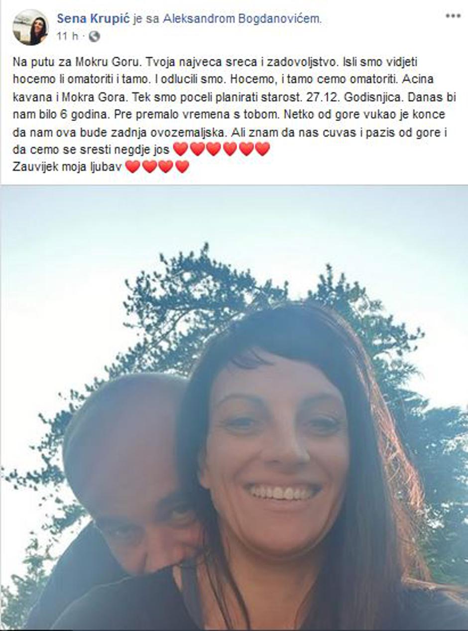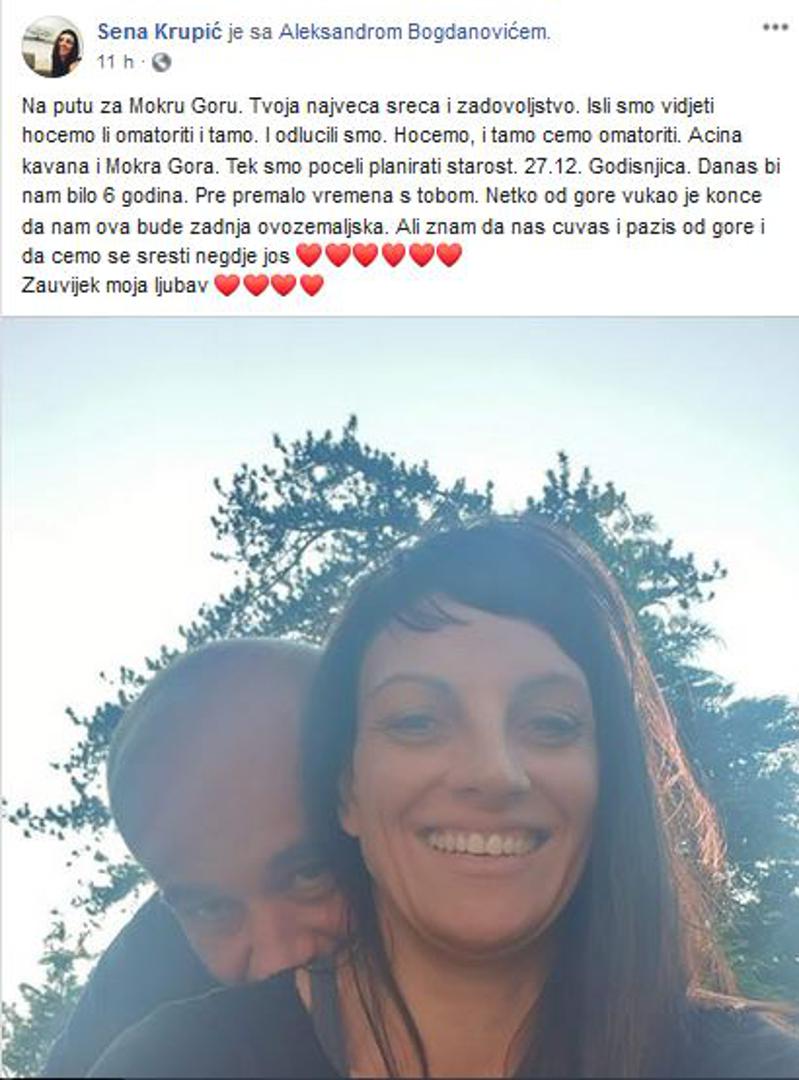 Tragična pogibija glumca Aleksandra Bogdanovića (45) ostavila je golemu prazninu u srcima obitelji, kolega i poznanika. Od prerano preminulog glumca na društvenim mrežama oprostila se i njegova supruga Sena Krupić s kojim bi jučer proslavio šestu godišnjicu ljubavi. Neutješna Sena objavila je njihovu posljednju zajedničku fotografiju koja je snimljena na putu za Mokru Goru gdje su planirali dočekati starost, no nebo je za njih imalo drugačije planove.