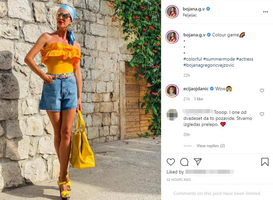 Glumica je ranije pak pozirala u vrućim traper hlačicama te kupaćem koji je nosila kao top. Kombinaciju je upotpunila torbom i cipelama u istoj nijansi žute te tako dodatno podigla cijelu kombinaciju. Upravo ovim odabirom Gregorić Vejzović je naglasila svoje duge i lijepo definirane noge. Kosu, koju je nedavno drastično skratila, prekrila je plavom maramom, a cijeloj šarenoj kombinaciji dodala je remen u duginim bojama. Otkrila je i da odmor provodi na svojem omiljenom Pelješcu kao i svake godine.