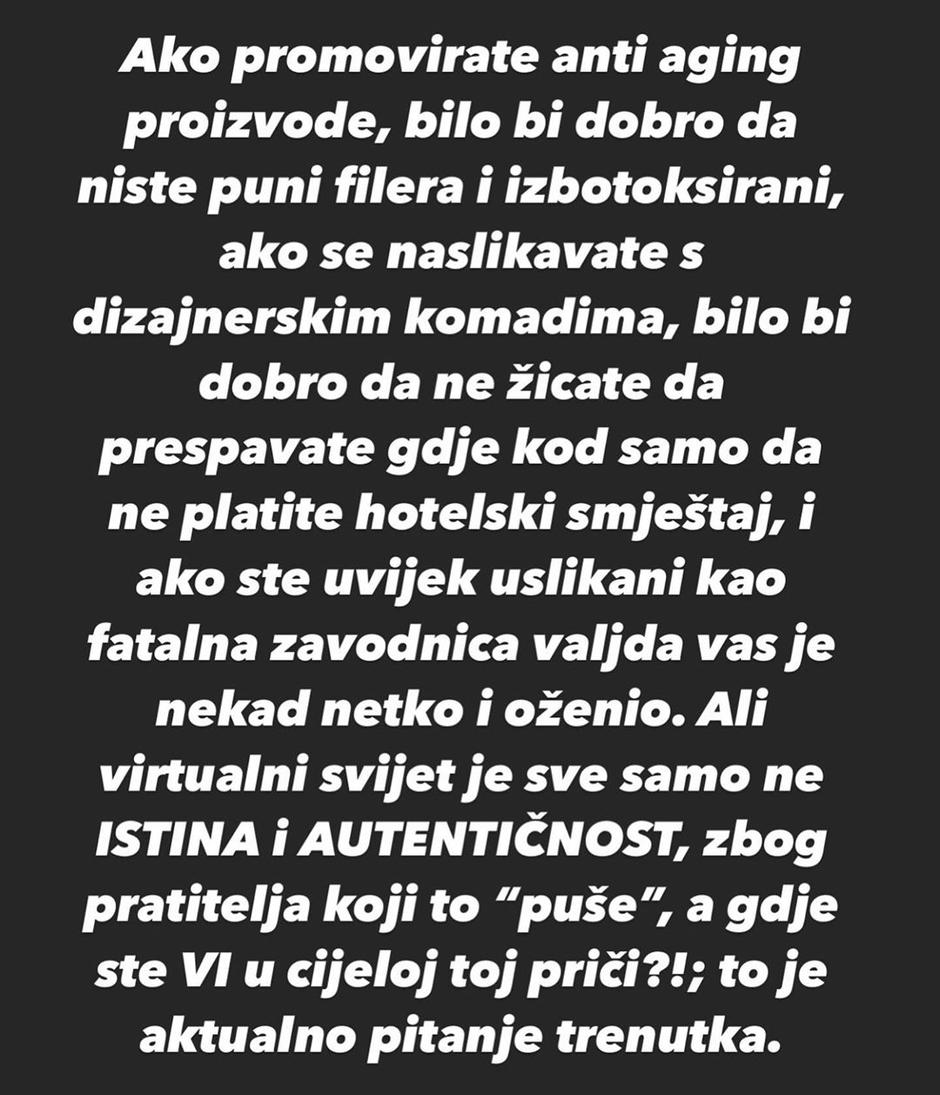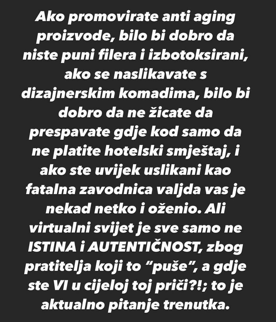- Ako promovirate proizvode protiv starenja, bilo bi dobro da niste puni filera i izbotoksirani. Ako se naslikavate s dizajnerskim komadima, bilo bi dobro da ne žicate da prespavate gdje god samo da ne platite hotelski smještaj, i ako ste uvijek uslikani kao fatalna zavodnica valjda vas je nekad netko i oženio. Ali virtualni svijet je sve samo ne istina i autentičnost, zbog pratitelja koji to ‘puše’. A gdje ste vi u cijeloj toj priči? To je aktualno pitanje trenutka - poručila je ova bivša dizajnerica. Njezini pratitelji smatraju kako je sasvim u pravu te da je najbolje opisala influencere.