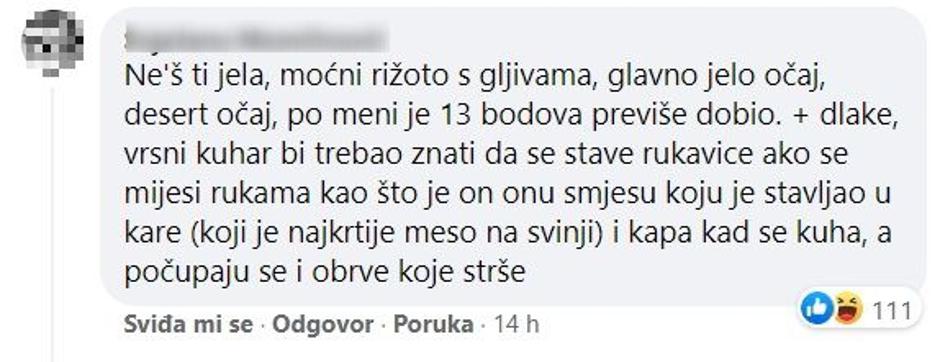 "Špiček i Pažanin na aparatima ako su gledali ovu epizodu", napisao je jedan od gledatelja ispod članka o Božidaru. "Po meni je 13 bodova previše dobio, plus dlake. Vrsni kuhar bi trebao znati da se stave rukavice ako se mijesi rukama", "Arogancija i manjak kulture doveli su ga do mjesta gdje je", "Taman kad mislim da sam vidjela sve, uvijek se nađe jedan koji nadmaši sve", nizali su se i ostali komentari.