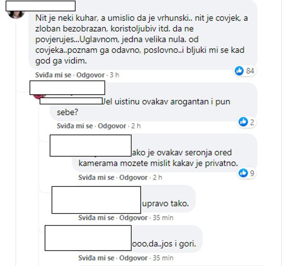 "Nit je neki kuhar, a umislio da je vrhunski.. nit je čovjek, a zloban bezobrazan, koristoljubiv itd. da ne povjeruješ...Uglavnom, jedna velika nula od čovjeka..poznam ga odavno, poslovno..i bljuki mi se kad god ga vidim", napisala je. "Jel uistinu ovakav arogantan i pun sebe?", nadovezao se u komentarima jedan od gledatelja. "Oooo, da, još i gori", zaključila je Božidarova poznanica.