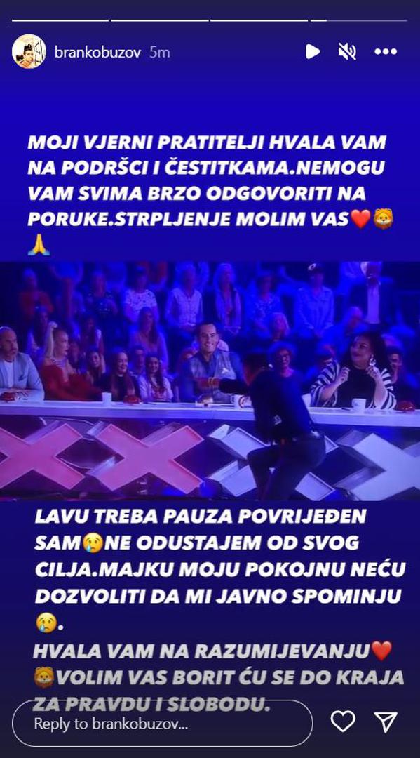 Četiri NE u epizodi ''Supertalenta'' koja se prikazivala na Novoj TV dobio je motivator Branko Buzov. Brankov nastup posebno je uzrujao i pjevačicu Maju Šuput koja je zbog njega opsovala, ali i tražila zaštitare. Branko se sada javio na Instagramu, te je pratiteljima poručio da je povrijeđen.