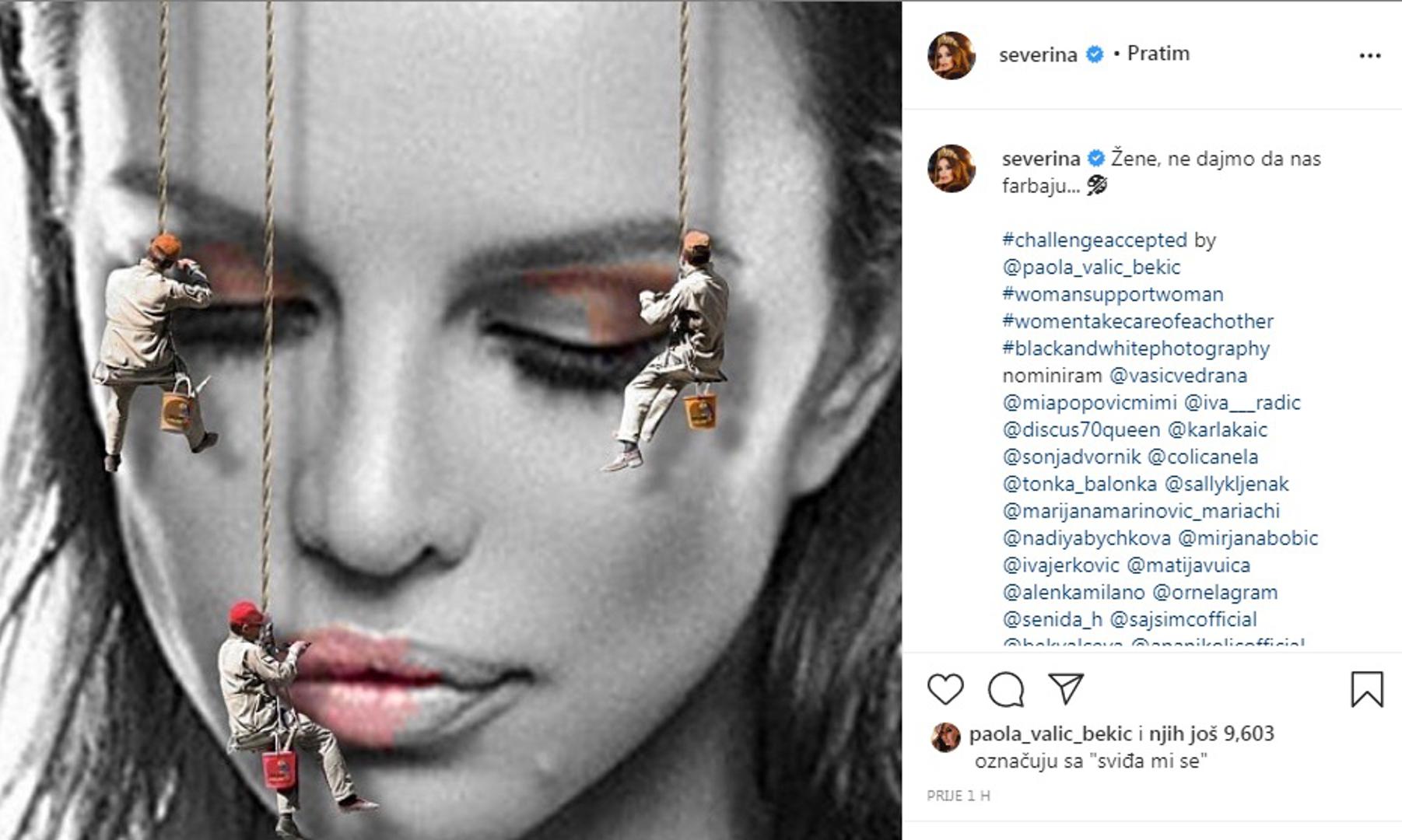 - Žene, ne dajmo da nas farbaju - napisala je Severina uz svoju fotografiju, te na izazov prozvala brojne poznate dame u Hrvatskoj, ali i regiji: Lepu Brenu, Senidah, Sandru Perković, Ivu Jerković, Matiju Vuicu i druge.