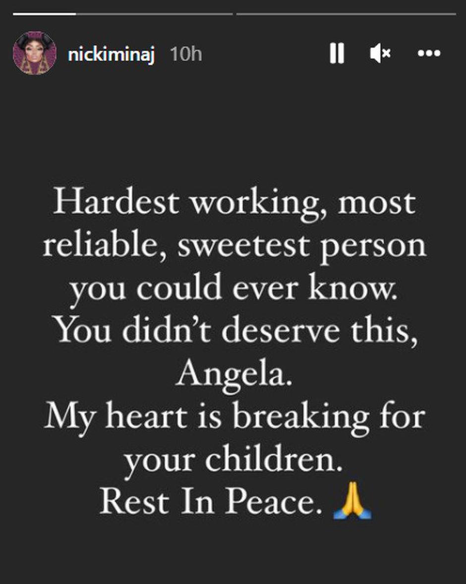 "Najvrjednija, najpouzdanija i najbolja osoba koju ste mogli poznavati. Nisi ovo zaslužila Angela. Srce mi je slomljeno zbog tvoje djece. Počivaj u miru", napisala je Nicki na svom Instagramu.