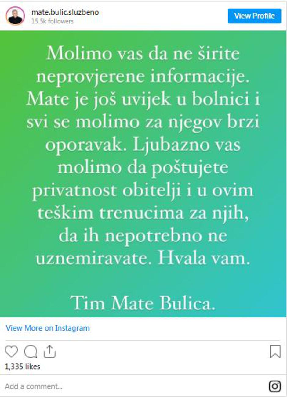 "Molimo vas da ne širite neprovjerene informacije. Mate je još uvijek u bolnici i svi se molimo za njegov brzi oporavak. Ljubazno vas molimo da poštujete privatnost obitelji i u ovim teškim trenucima za njih da ih nepotrebno ne uznemiravate. Hvala vam. Tim Mate Bulića" stoji u objavi koja je osvanula na pjevačevu profilu mjesec dana nakon što su na istom mjestu potvrdili da je Bulić zaražen i da se liječi u bolnici.