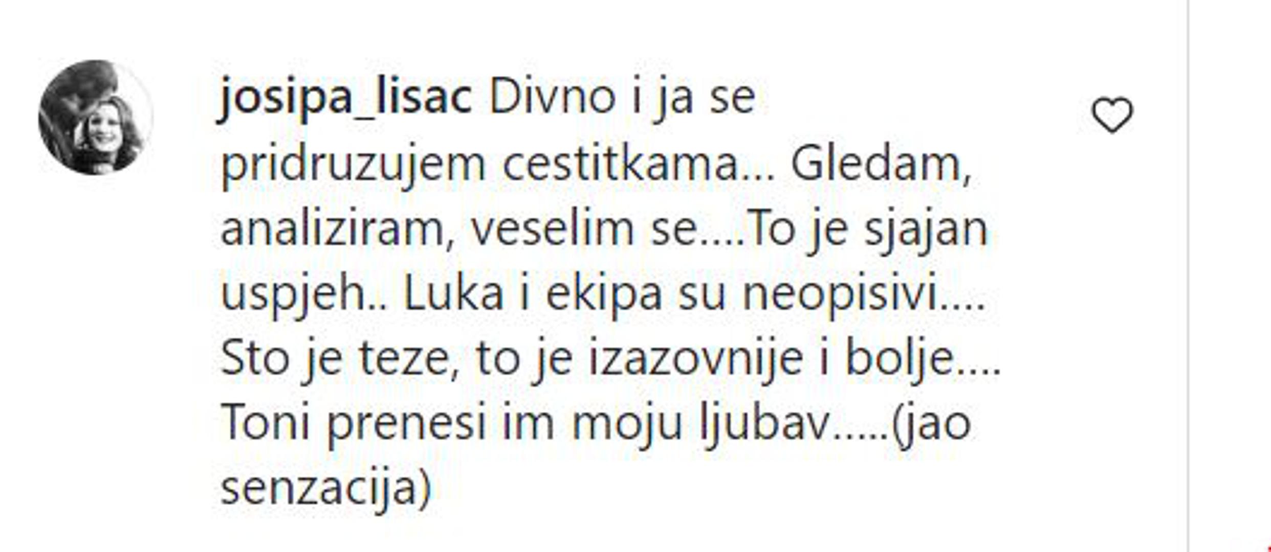 "Divno, i ja se pridružujem čestitkama… Gledam, analiziram, veselim se….To je sjajan uspjeh.. Luka i ekipa su neopisivi…. Što je teže, to je izazovnije i bolje….