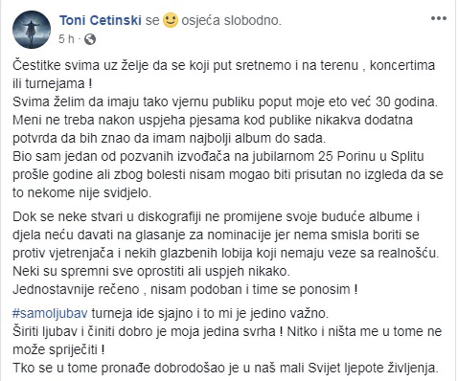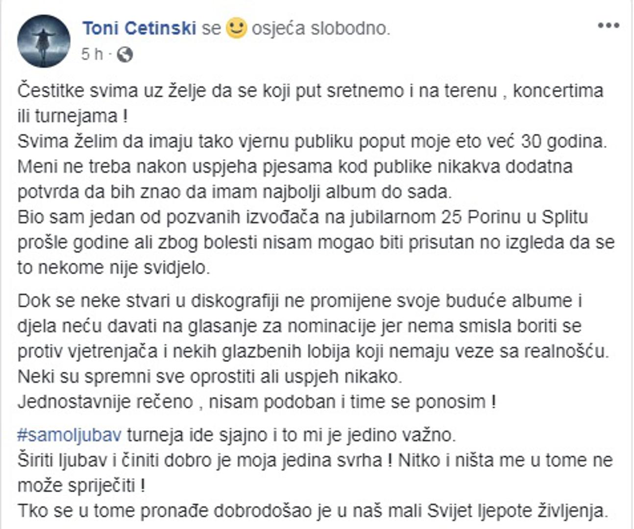 Bio sam jedan od pozvanih izvođača na jubilarnom 25 Porinu u Splitu prošle godine ali zbog bolesti nisam mogao biti prisutan no izgleda da se to nekome nije svidjelo. Dok se neke stvari u diskografiji ne promijene svoje buduće albume i djela neću davati na glasanje za nominacije jer nema smisla boriti se protiv vjetrenjača i nekih glazbenih lobija koji nemaju veze sa realnošću. Neki su spremni sve oprostiti ali uspjeh nikako. Jednostavnije rečeno , nisam podoban i time se ponosim ! #samoljubav turneja ide sjajno i to mi je jedino važno. Širiti ljubav i činiti dobro je moja jedina svrha ! Nitko i ništa me u tome ne može spriječiti ! Tko se u tome pronađe dobrodošao je u naš mali Svijet ljepote življenja - napisao je Tony.