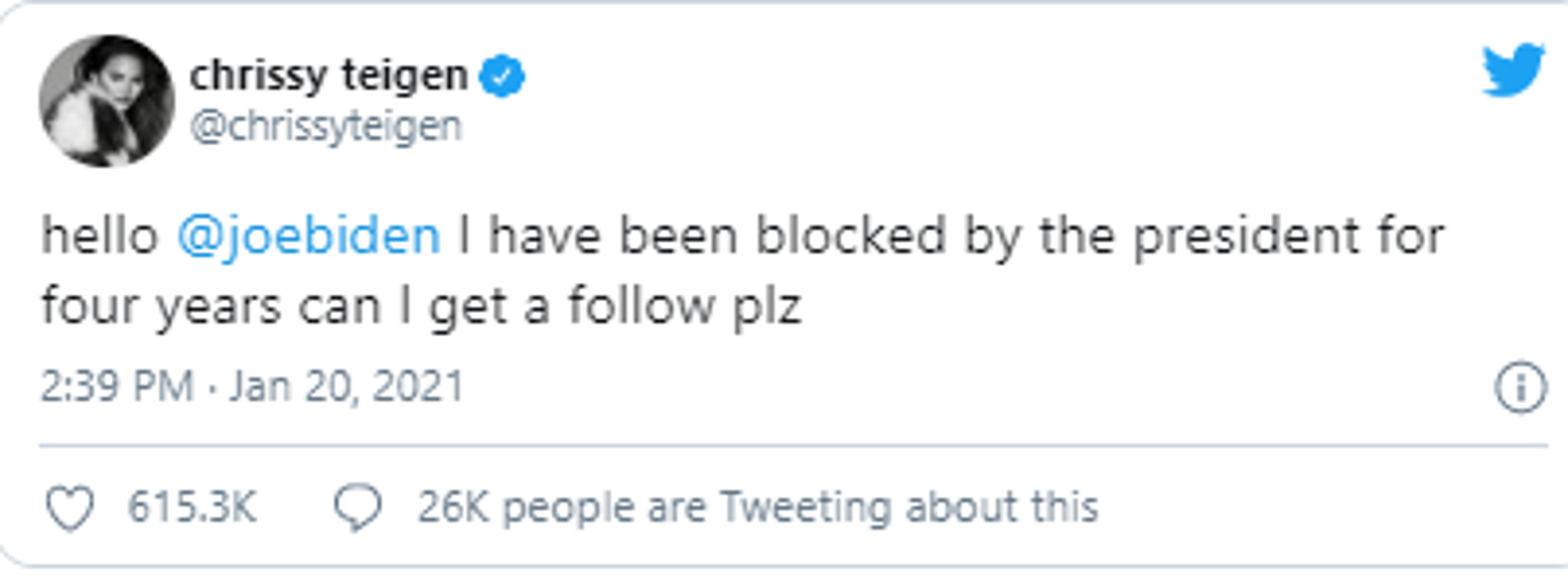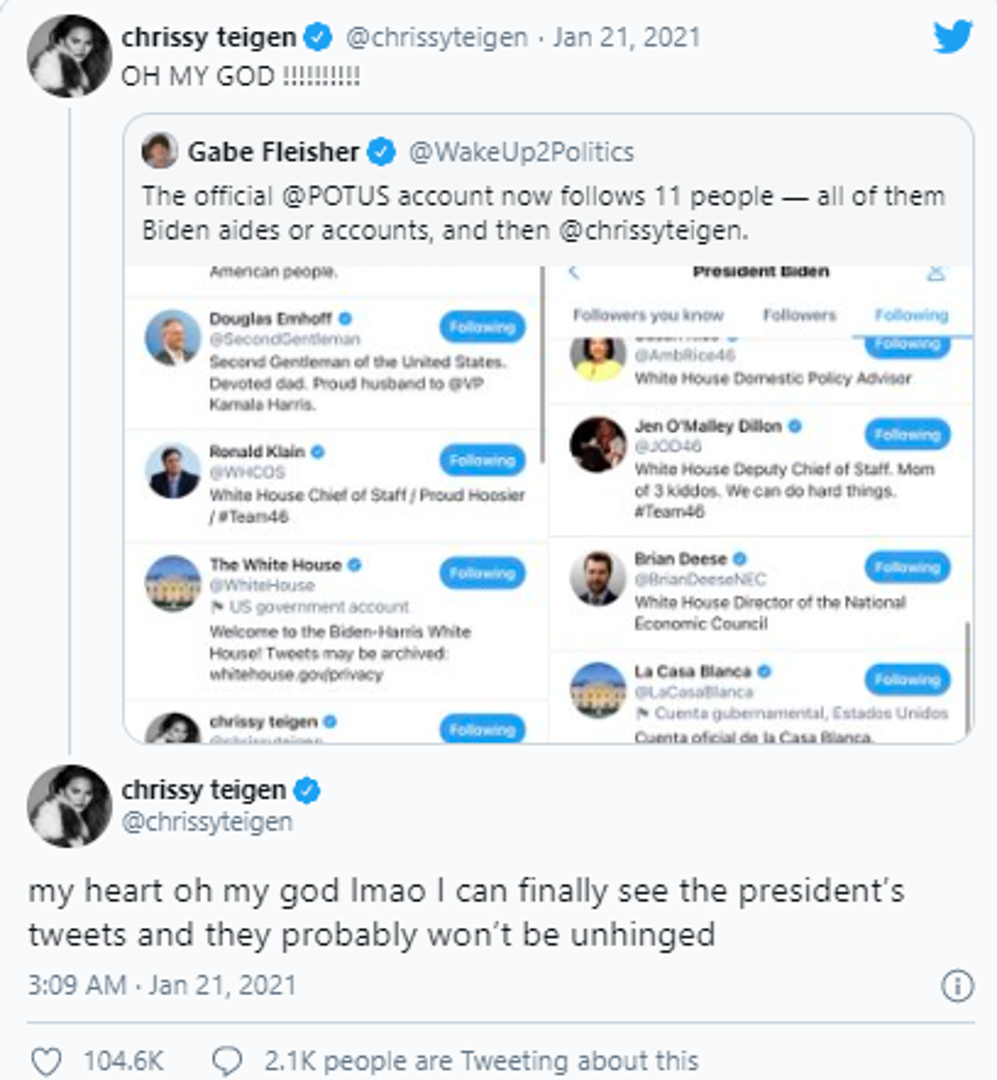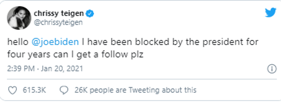 Joe Biden i službeno je postao novi predsjednik Sjedinjenih Američkih Država, a s time je preuzeo i službeni profil američkog predsjednika na Twitteru. Naime, četiri se godine na listi blokiranih Twitter profila nalazila manekenka Chrissy Teigen koja se direktno obratila na toj platformi Joeu Bidenu.
