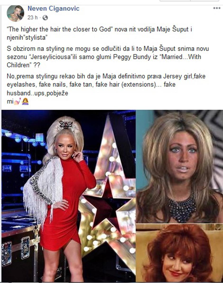 "The higher the hair the closer to God” nova nit vodilja Maje Šuput i njenih”stylista” S obzirom na styling ne mogu se odlučiti da li to Maja Šuput snima novu sezonu “Jerseyliciousa” ili samo glumi Peggy Bundy iz “Married...With Children” ?? No, prema stylingu rekao bih da je Maja definitivno prava Jersey girl,fake eyelashes, fake nails, fake tan, fake hair (extensions)… fake husband..ups,pobježe mi - napisao je Ciganović jučer na svom profilu.