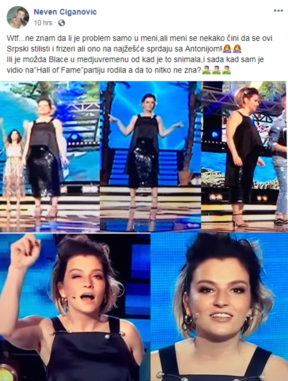 - Ne znam da li je problem samo u meni, ali meni se nekako čini da se ovi Srpski stilisti i frizeri ali ono na najžešće sprdaju s Antonijom! Ili je možda Blaće u međuvremenu od kad je to snimala, i sada kad sam je vidio na ”Hall of Fame” partiju rodila, a da to nitko ne zna? - napisao je Ciganović.