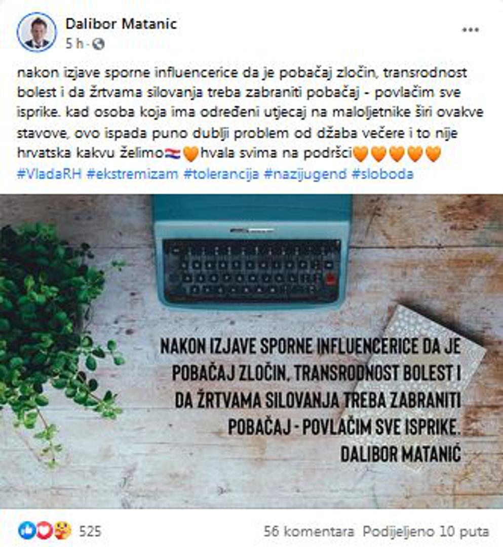 - Nakon izjave sporne influencerice da je pobačaj zločin, transrodnost bolest i da žrtvama silovanja treba zabraniti pobačaj - povlačim sve isprike. kad osoba koja ima određeni utjecaj na maloljetnike širi ovakve stavove, ovo ispada puno dublji problem od džaba večere i to nije hrvatska kakvu želim. hvala svima na podršci - napisao je Matanić na svom profilu.