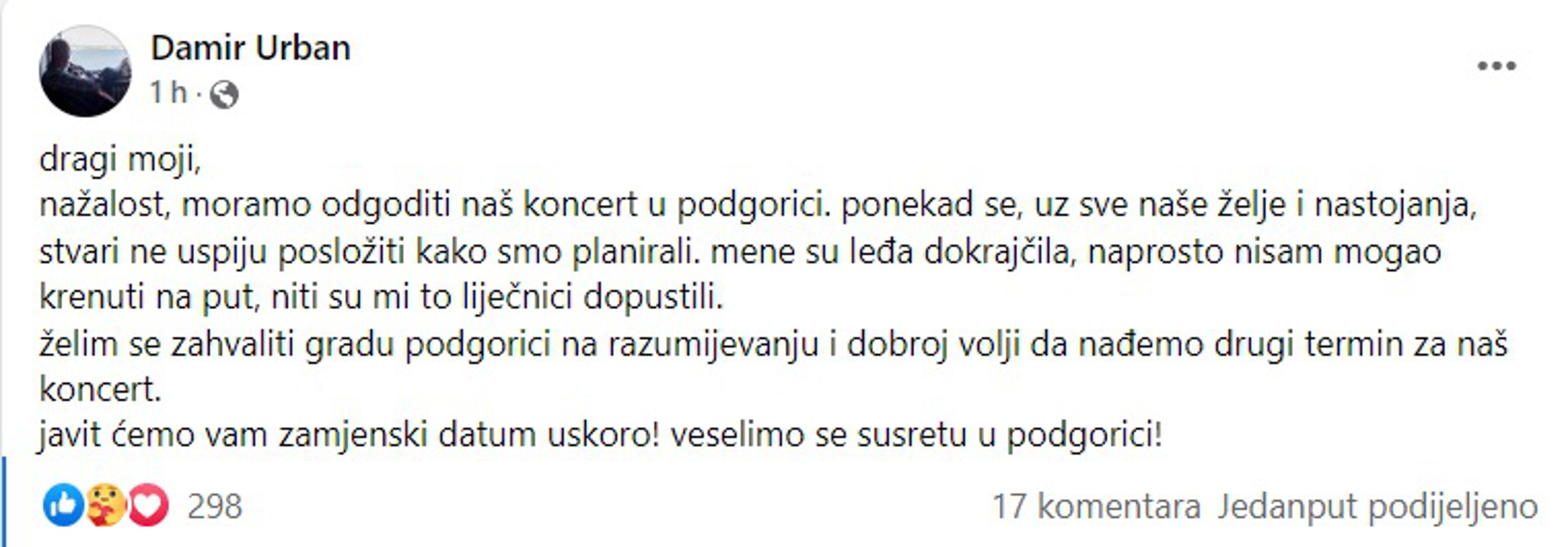 - Dragi moji, nažalost, moramo odgoditi naš koncert u Podgorici. Ponekad se, uz sve naše želje i nastojanja, stvari ne uspiju posložiti kako smo planirali. Mene su leđa dokrajčila, naprosto nisam mogao krenuti na put, niti su mi to liječnici dopustili. Želim se zahvaliti gradu Podgorici na razumijevanju i dobroj volji da nađemo drugi termin za naš koncert. Javit ćemo vam zamjenski datum uskoro! Veselimo se susretu u Podgorici! - napisao je Urban. Ispod objave odmah su se zaredali komentari obožavatelja koji su mu poželjeli brz oporavak.