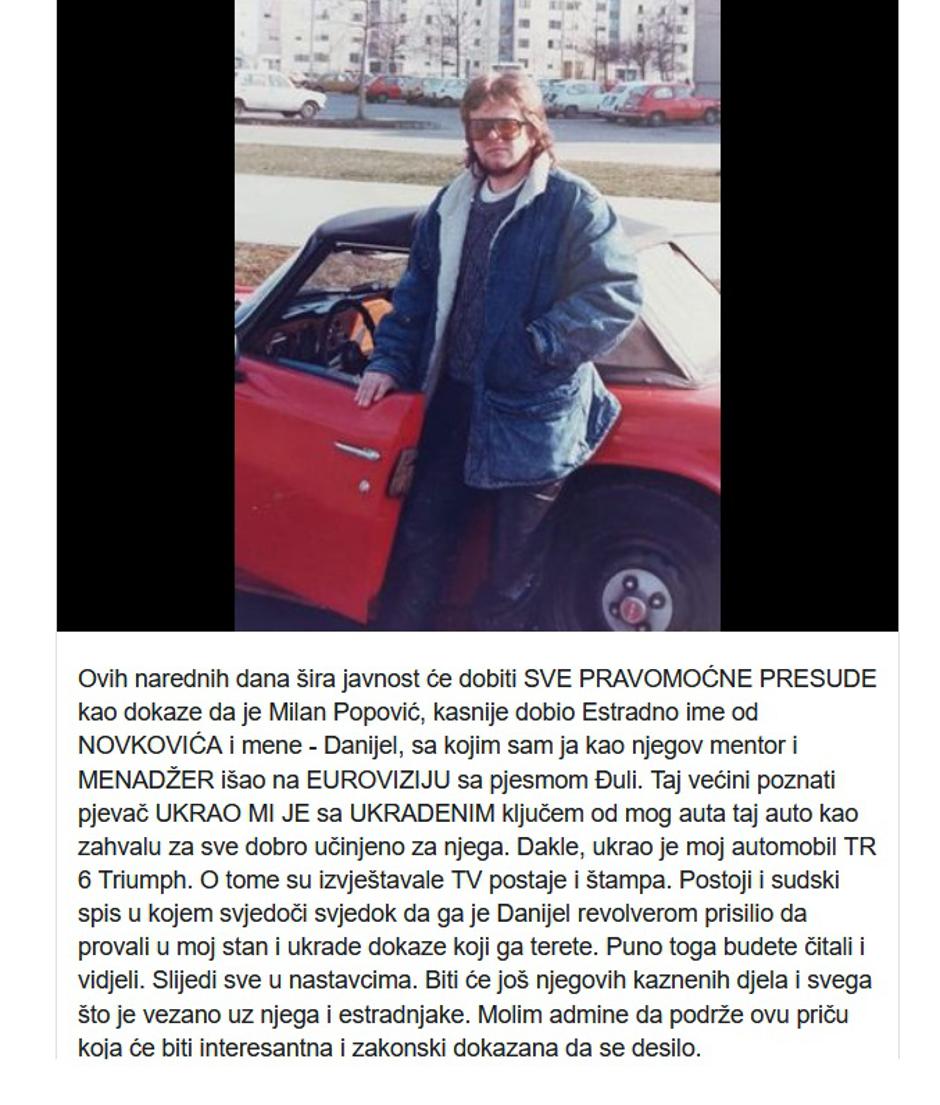 - Ovih narednih dana šira javnost će dobiti sve pravomoćne presude kao dokaze da je Milan Popović, kasnije dobio estradno ime od Novkovića i mene - Danijel, s kojim sam ja kao njegov mentor i menadžer išao na Eurovoziju sa pjesmom Đuli. Taj većini poznat pjevač ukrao mi je sa ukradenim ključem od mog auta taj auto kao zahvalu sa sve dobro učinjeno za njega. Dakle ukrao je moj automobil TR 6 Triumph. O tome su izvještavale TV postaje i štampa. Postoji i sudski spis u kojem svjedoči svjedok da ga je Danijel revolverom prisilio da provali u moj stan i ukrade dokaze koji ga terete. Puno toga budete čitali i vidjeli. Biti će još njegovih kaznenih djela i svega što je vezano uz njega i estradnjake. Molim admine da podrže ovu priču koja će biti interesantna i zakonski dokazana da se to dogodilo - napisao je sa svog profila na Facebooku 15. travnja, pa se dva tjedna kasnije opet oglasio sljedećim tekstom: