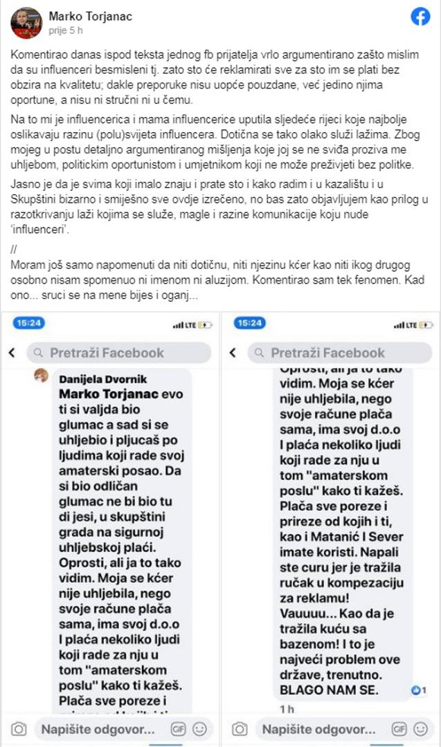 "Komentirao danas ispod teksta jednog fb prijatelja vrlo argumentirano zašto mislim da su influenceri besmisleni tj. zato što će reklamirati sve za što im se plati bez obzira na kvalitetu; dakle preporuke nisu uopće pouzdane, već jedino njima oportune, a nisu ni stručni ni u čemu. Na to mi je influencerica i mama influencerice uputila sljedeće riječi koje najbolje oslikavaju razinu (polu)svijeta influencera. Dotična se tako olako služi lažima. Zbog mojeg u postu detaljno argumentiranog mišljenja koje joj se ne sviđa proziva me uhljebom, političkim oportunistom i umjetnikom koji ne može preživjeti bez politike", napisao je Torjanac, a onda i objavio što mu je napisala Danijela Dvornik.