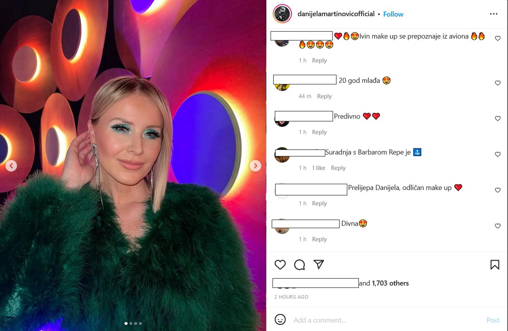 "Hit", "Predivna", "Šminka, outfit.....sve!!! 😮🔥👏❤️", "Odličan styling", "Zeleno ti odlično stoji", "Izgledaš 20 godina mlađe", "Danijela, blistaš", samo su neki od komentara oduševljenih pratitelja. Neki su pohvalili i Danijelinu suradnju sa stilisticom Barbarom Repe koja stoji iza njezinih odjevnih kombinacija.