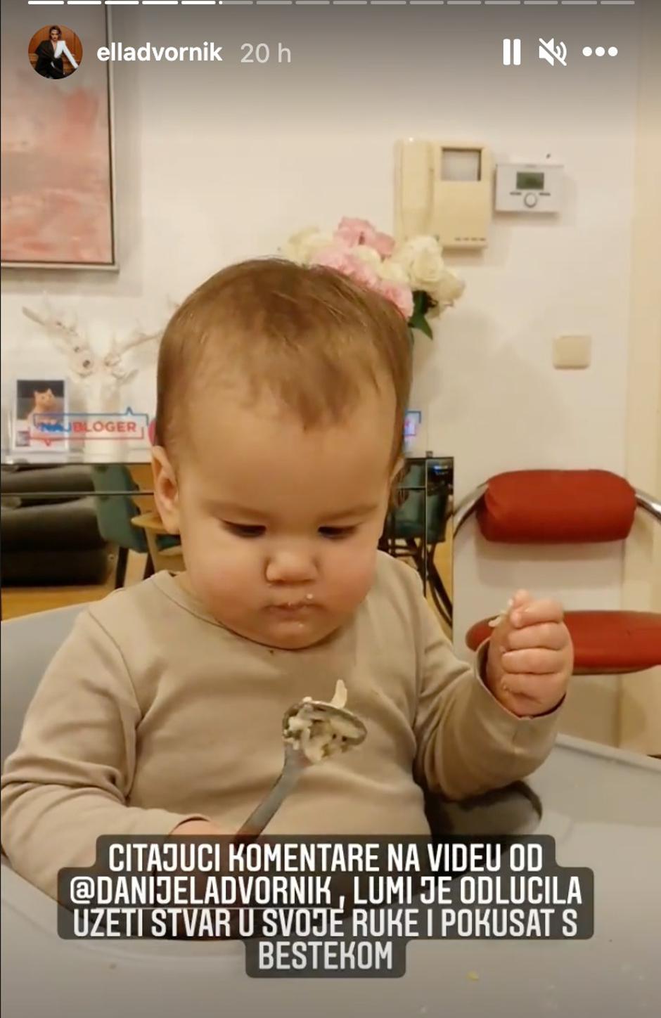 - Djetetu od niti godine dana dati da jede špagete i to rukama, mogla je mama bar narezati na manje komadiće pa da dijete žličicom jede, jadna kako se zagrcala. Ali ovo...", "Je li ovo za slikanje ili dijete stvarno jede na ovaj način? - pisale su Danijeline pratiteljice u komentarima. Danijela Dvornik je na ove komentare uzvratila: Prestrašnoooooooooo, dijete jede rukamaaaa... Zovite socijalnu službu, hitno! Inače, ruke služe za ukras. Isuse... Prestanite dramiti oko svega. Lumi je preslatka i hoće sama jesti. Nakon komentara koje je pročitala na maminom profilu Danijelina kći Ella snimila je novi video u kojem Lumi jede žlicom i napisala je: