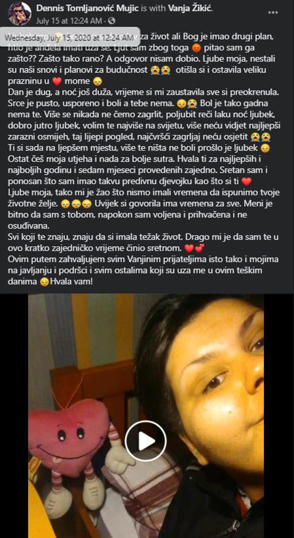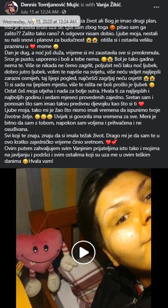Dečko preminule natjecateljice ''Života na vagi'' Vanje Žikić, Denis Tomljanović Mujić objavio je emotivnu poruku za svoju djevojku.