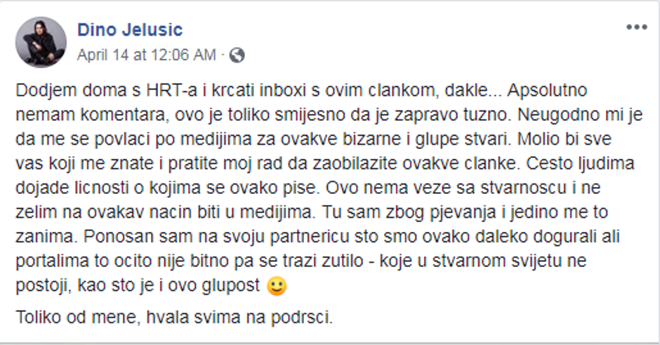 “Apsolutno nemam komentara, ovo je toliko smiješno da je zapravo tužno. Neugodno mi je da me se povlači po medijima za ovakve bizarne i glupe stvari. Molio bih sve vas koji me znate i pratite moj rad da zaobilazite ovakve članke", napisao je mladi pjevač i dodao: